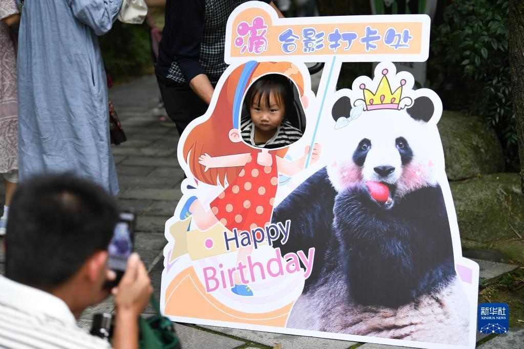 5月29日,在成都大熊貓繁育研究基地都江堰野放繁育研究中心,游客與梅蘭生日裝飾品合影留念。