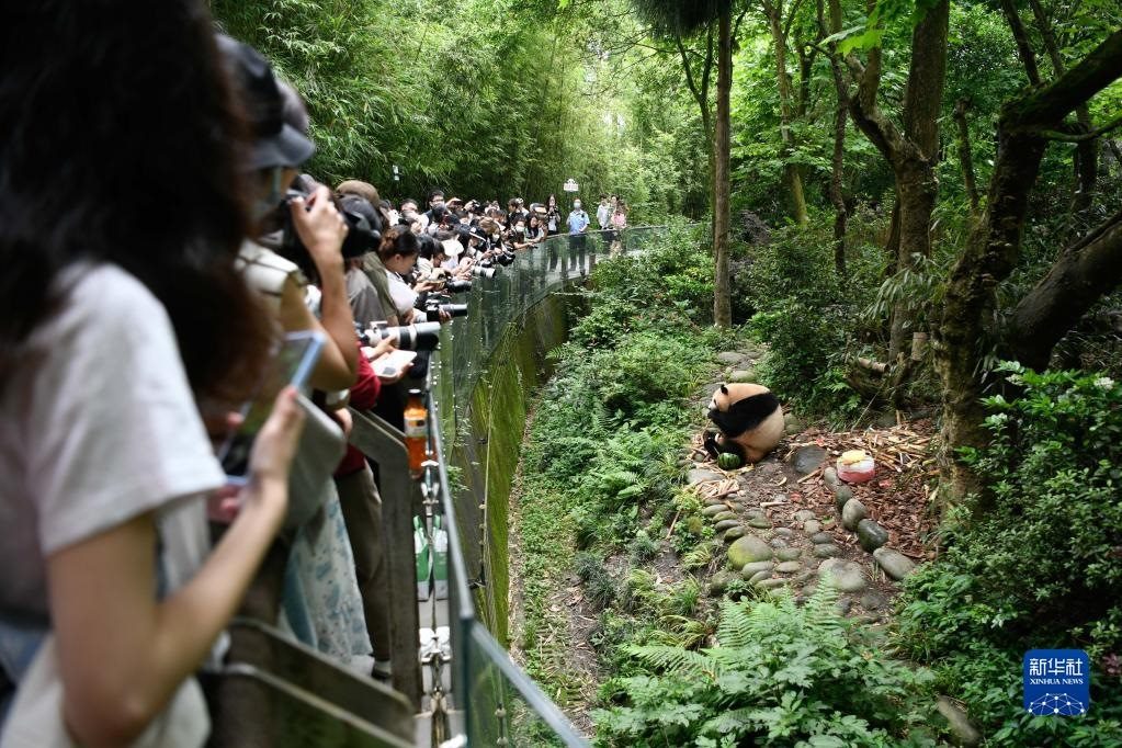 5月29日,市民在成都大熊貓繁育研究基地都江堰野放繁育研究中心為梅蘭慶祝生日。