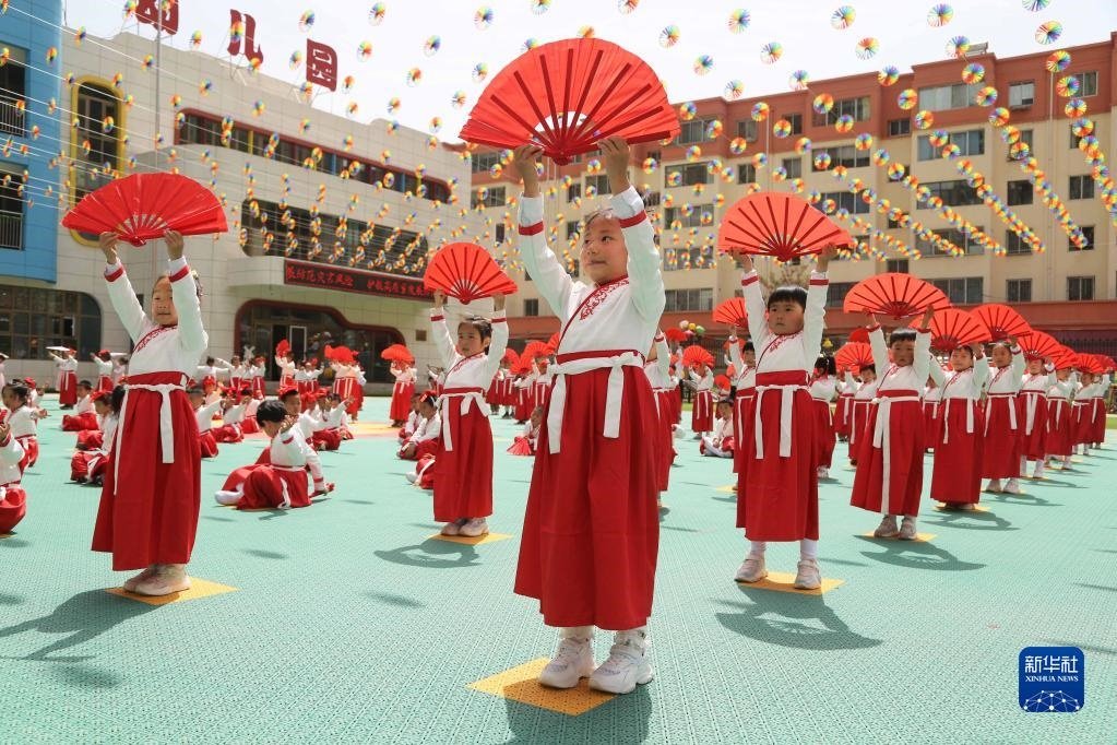 5月30日,在河北省唐山市豐潤(rùn)區(qū)左家塢鎮(zhèn)中心幼兒園,孩子們?cè)诒硌菸椠埞?jié)目(無人機(jī)照片)。 新華社發(fā)(朱大勇攝)