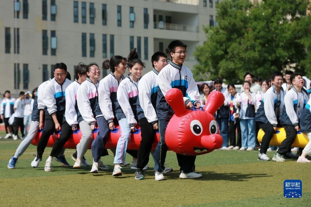 高考臨近,安徽省淮北市第十二中學(xué)組織高三年級(jí)學(xué)生開展豐富多彩的集體減壓活動(dòng),讓學(xué)生們?cè)谌の队螒蛑嗅尫艍毫?,以輕松、樂觀、自信的心態(tài)迎接高考。新華社發(fā)(萬善朝 攝)