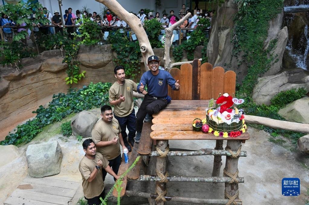 5月31日,在馬來西亞吉隆坡附近的馬來西亞國家動(dòng)物園,大熊貓飼養(yǎng)員阿克邁勒(右)和他的團(tuán)隊(duì)與“升誼”的生日蛋糕合影。