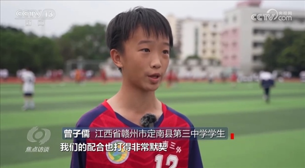 江西省贛州市定南縣第三中學(xué)學(xué)生曾子儒:“踢足球之前自己體弱多病,身體素質(zhì)比較差,別提去踢這么一場(chǎng)激烈的足球比賽,就是讓我圍著操場(chǎng)跑一圈都?xì)獯跤??!?br>