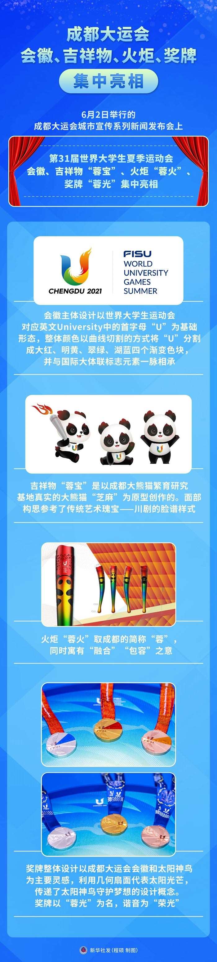 新華社成都6月2日電(記者董小紅、陳地)2日舉行的成都大運會城市宣傳系列新聞發(fā)布會上,第31屆世界大學生夏季運動會會徽、吉祥物“蓉寶”、火炬“蓉火”、獎牌“蓉光”集中亮相。