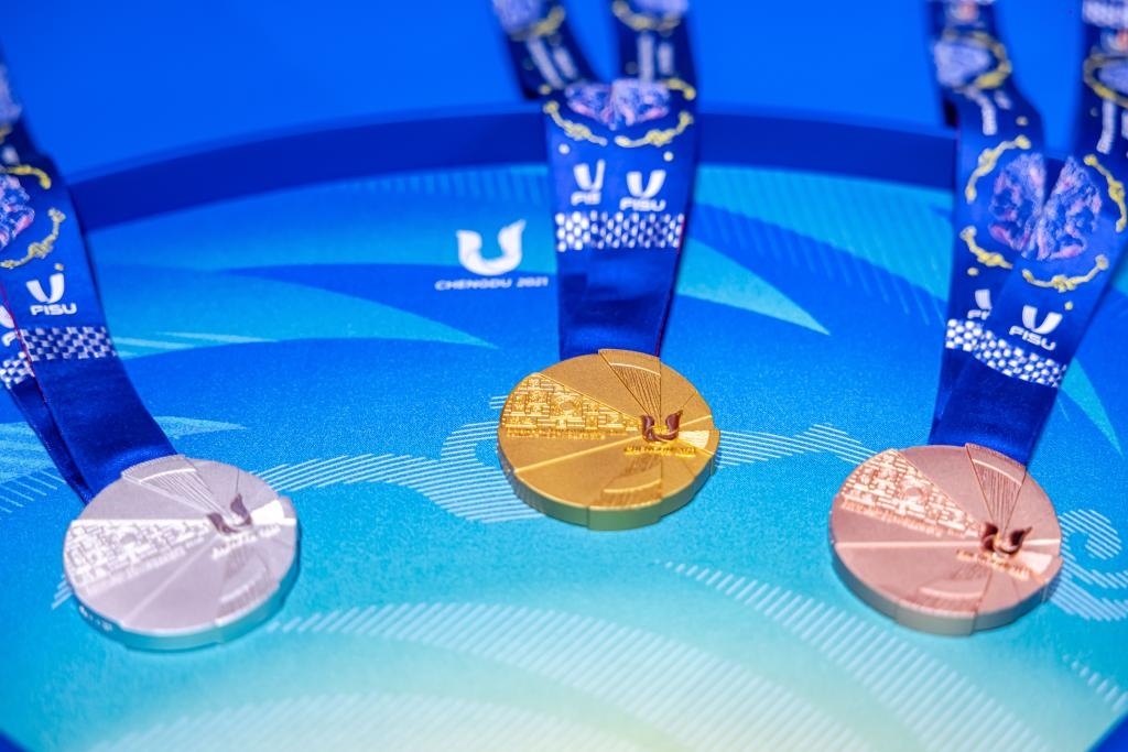 獎牌是每個體育賽事的重要組成部分之一,本屆大運會獎牌根據(jù)國際大體聯(lián)要求,融合成都和國際化傳播元素,最終形成了大運會獎牌“蓉光”。獎牌整體設計以成都大運會會徽和太陽神鳥為主要靈感,利用幾何扇面代表太陽光芒,傳遞了太陽神鳥守護夢想的設計概念。獎牌以“蓉光”為名,諧音為“榮光”,寓意榮耀、光彩,寄托了對大運健兒在成都青春展翅、乘夢而行的美好期許。