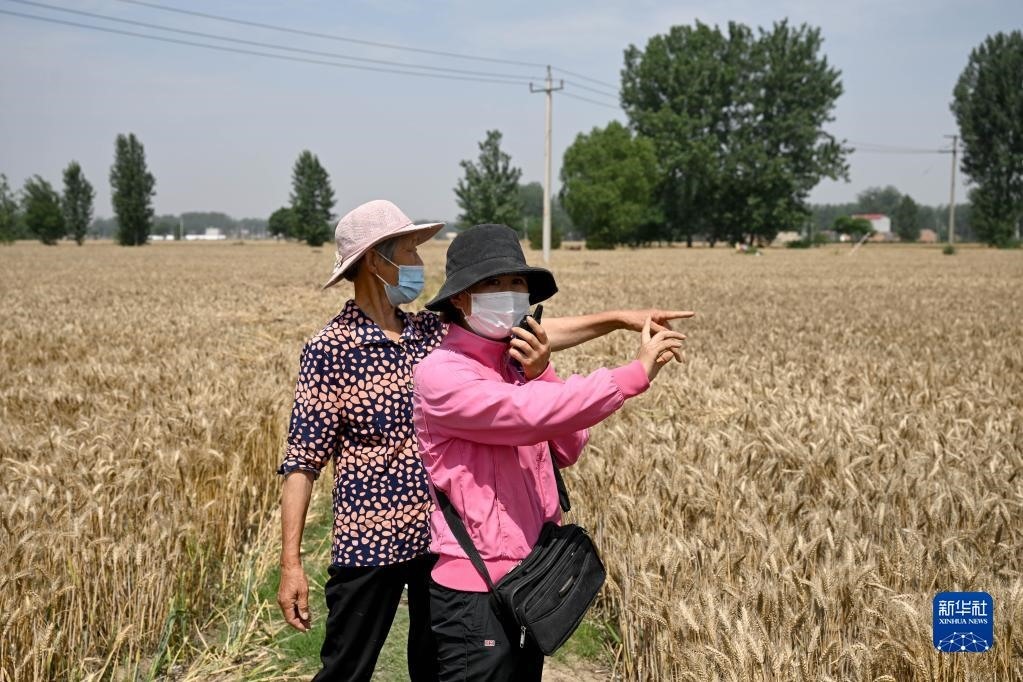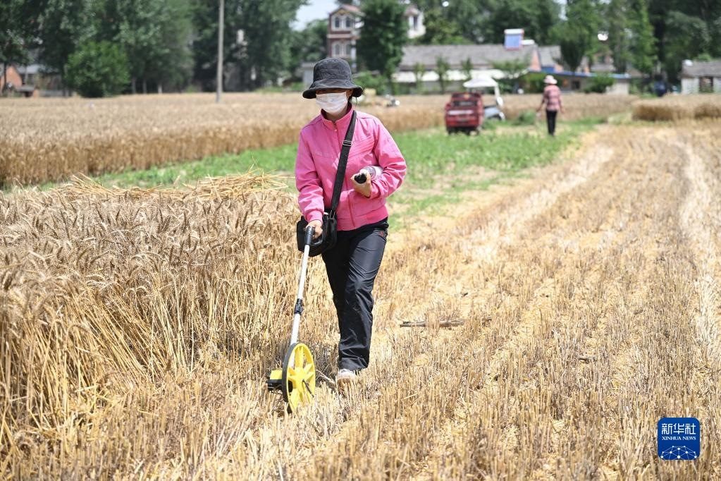 6月2日,在安徽省阜陽市阜南縣許堂鄉(xiāng)劉崗村,陳麗娟使用農田測畝儀測量麥田的面積。