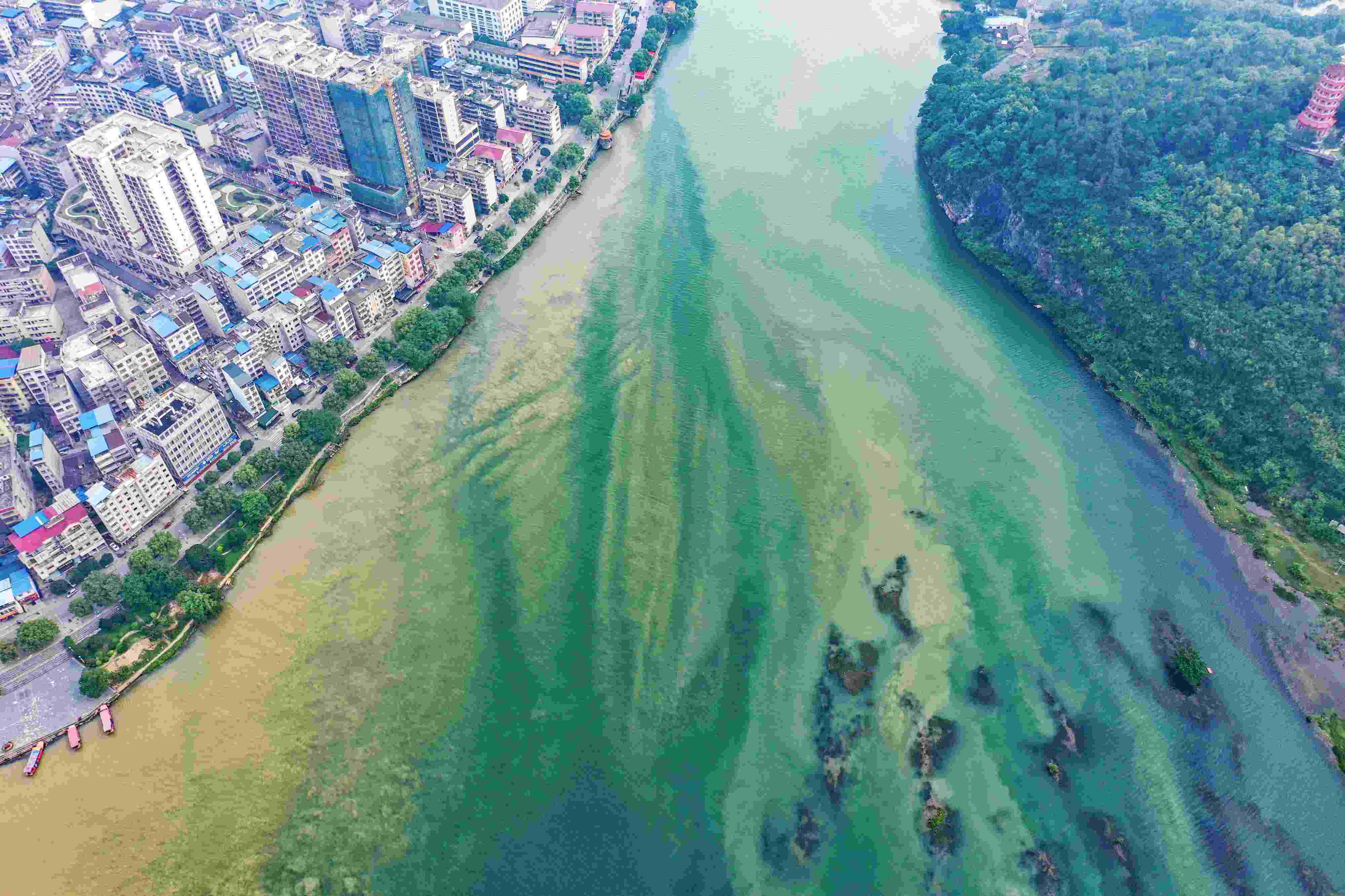 2023年6月4日,受降雨影響,廣西桂林全州縣城湘江河段出現(xiàn)涇渭分明景觀??罩懈╊?,湘江支流萬鄉(xiāng)河混濁的河水繞城匯入清澈的湘江干流,交匯之處涇渭分明。 視覺中國(guó)