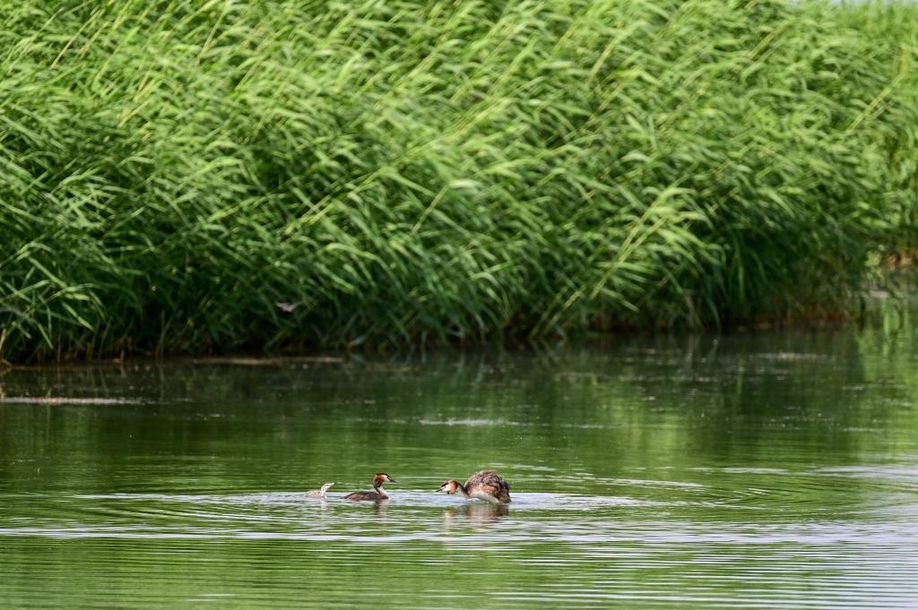 6月5日,水鳥(niǎo)在烏梁素海水面上嬉戲。新華社記者 連振 攝