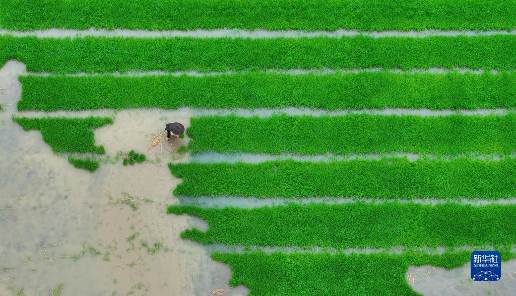 6月5日,在湖南省永州市道縣營(yíng)江街道芒頭寨村,農(nóng)民在平整水田。