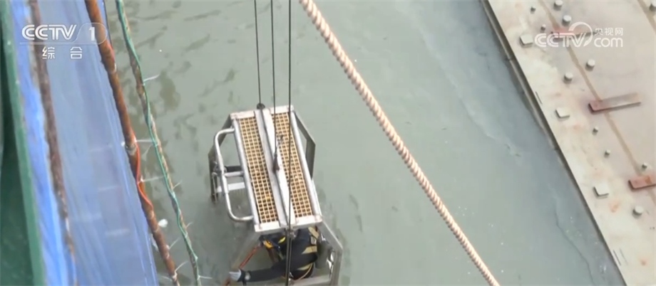 6月9日凌晨5時(shí)左右,準(zhǔn)備潛水檢查作業(yè)的4名潛水員分別從船頭船尾下水,檢查即將安裝的最后一個(gè)管節(jié)兩端是否存在異物,并在水下安裝最終接頭測控設(shè)備。