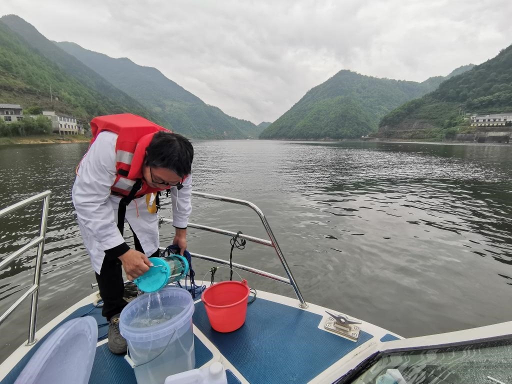 圖為5月24日,生態(tài)環(huán)保工作者在新安江皖浙兩省交界處,把從新安江中取出的水樣倒進(jìn)桶里。 新華社記者劉方強(qiáng) 攝
