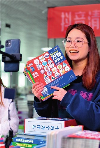 廊坊市永清經(jīng)濟開發(fā)區(qū)京聯(lián)集團館配圖書聯(lián)合現(xiàn)采基地,工作人員在電商平臺直播銷售圖書(2023年3月26日攝)。駱學(xué)峰攝/本刊