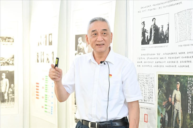 會后,領(lǐng)導(dǎo)嘉賓觀看“背負民族希望—紀念新四軍成立86周年回顧展”,張曉龍現(xiàn)場給大家講述新四軍的歷史沿革和征戰(zhàn)歷程。