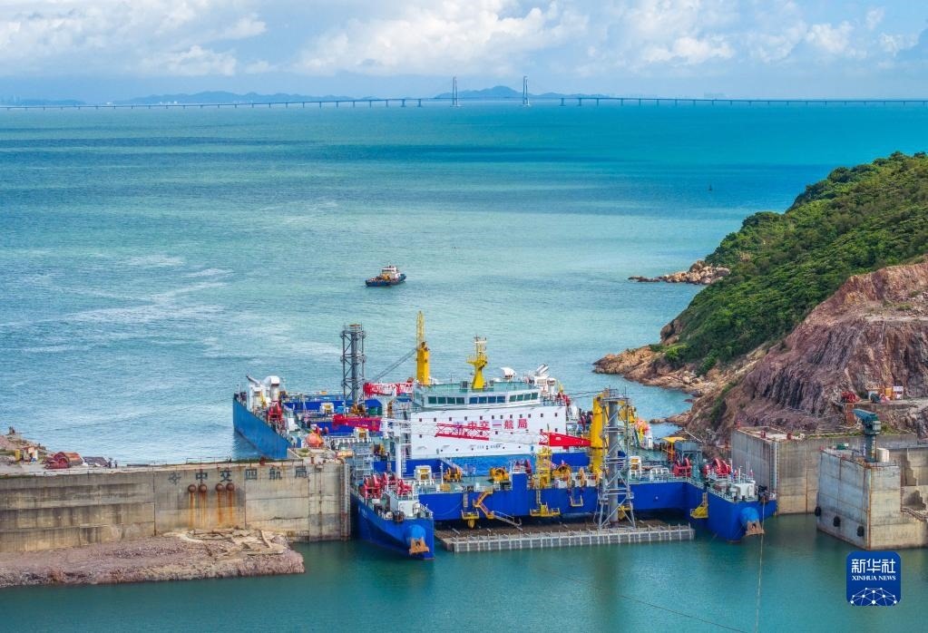 “一航津安1”號(hào)沉管運(yùn)輸安裝一體船將E23管節(jié)和最終接頭浮運(yùn)至安裝現(xiàn)場(chǎng)時(shí)經(jīng)過(guò)港珠澳大橋(6月8日攝,無(wú)人機(jī)照片)。