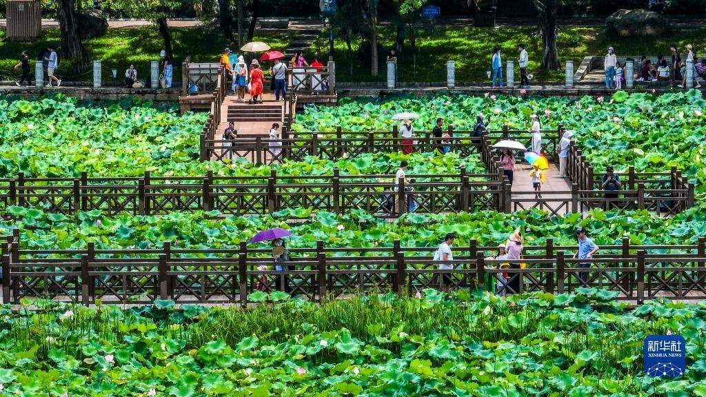 盛夏時節(jié),廣西南寧市南湖之濱的荷花漸次綻放,吸引游客前來觀賞。