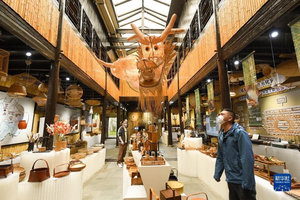 在浙江衢州龍游縣溪口村,游客在一家青年創(chuàng)客工作室的展廳觀賞竹制工藝品(4月3日攝)。新華社記者 翁忻旸 攝