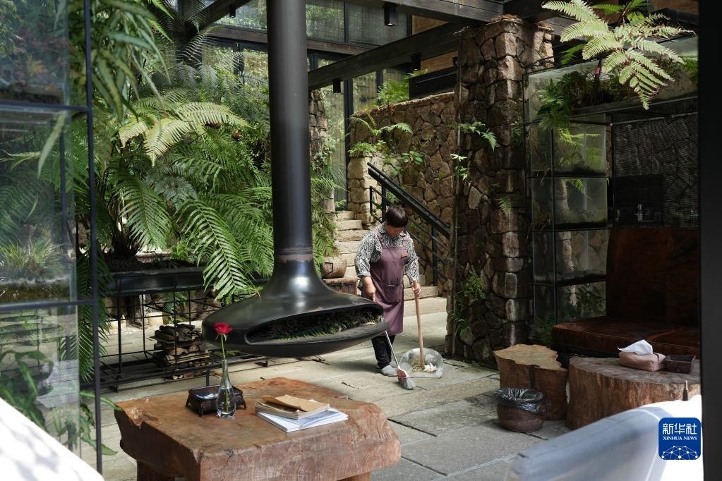 攝工作人員在浙江金華浦江縣虞宅鄉(xiāng)一家由古村落改建的民宿內(nèi)打掃(5月23日攝)。新華社記者 翁忻旸