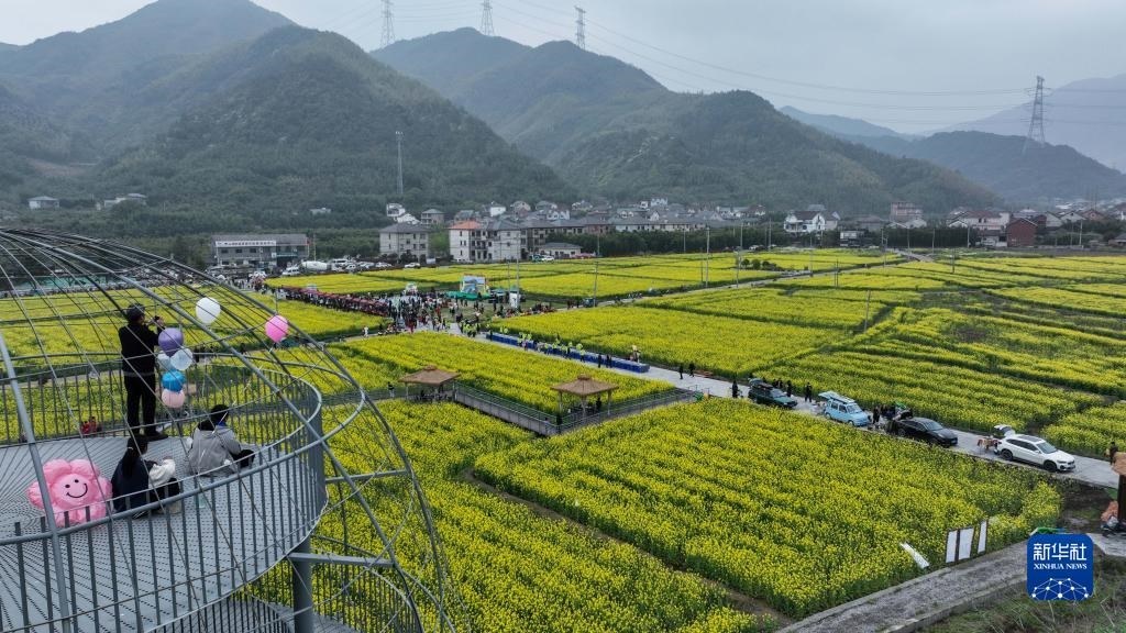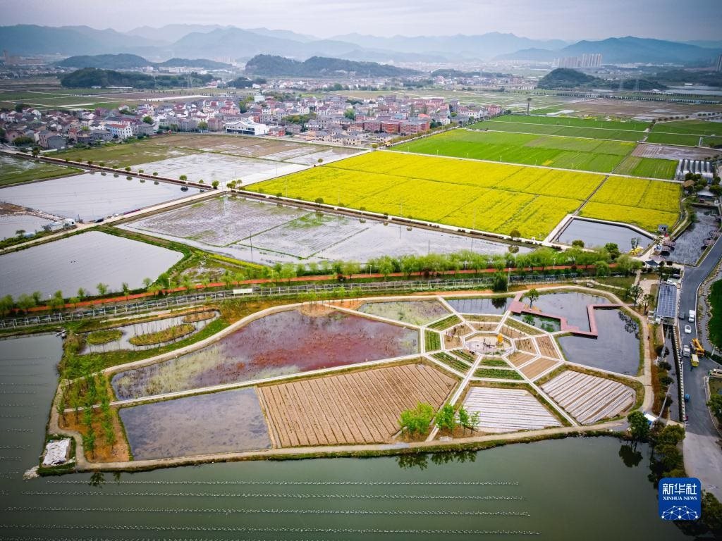 浙江諸暨楓橋鎮(zhèn)杜黃新村農(nóng)耕體驗(yàn)研學(xué)基地(無(wú)人機(jī)照片,3月29日攝)。近年來(lái),當(dāng)?shù)赝瞥鍪喾N農(nóng)事特色體驗(yàn)項(xiàng)目,著力打造“田上杜黃”這一文旅品牌。新華社記者 江漢 攝