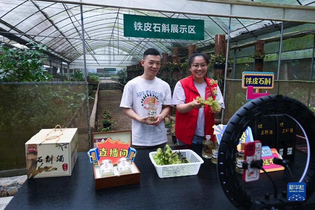 在浙江諸暨東白湖鎮(zhèn)的鐵皮石斛有機(jī)種植基地,東白湖鎮(zhèn)黨員志愿者(右)和基地負(fù)責(zé)人一起直播銷售鐵皮石斛花茶、鐵皮石斛酒等產(chǎn)品(6月8日攝)。近年來(lái),東白湖鎮(zhèn)著力發(fā)展鐵皮石斛等特色農(nóng)業(yè)產(chǎn)業(yè),加快農(nóng)業(yè)數(shù)字化轉(zhuǎn)型,推進(jìn)農(nóng)特產(chǎn)品交易服務(wù)中心、惠農(nóng)綜合平臺(tái)以及直播經(jīng)濟(jì)的發(fā)展。新華社記者 徐昱 攝