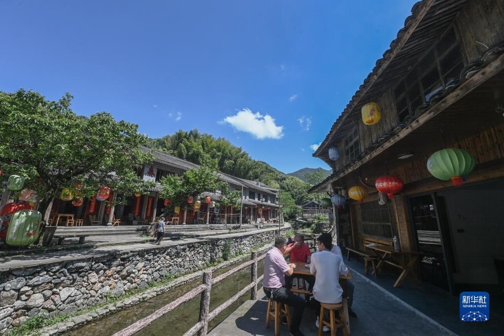 人們?cè)谡憬_(tái)州黃巖區(qū)嶼頭鄉(xiāng)布袋坑村的溪水旁喝茶(5月30日攝)。近年來(lái),嶼頭鄉(xiāng)堅(jiān)持黨建引領(lǐng),以全域旅游和美麗鄉(xiāng)村建設(shè)為重要抓手,引進(jìn)文化創(chuàng)意團(tuán)隊(duì),為鄉(xiāng)村旅游注入更加年輕化的元素,推進(jìn)特色民宿以及布袋山饅頭、溪坑魚等農(nóng)特產(chǎn)品的發(fā)展,帶動(dòng)鄉(xiāng)村振興和百姓共富。新華社記者 徐昱 攝