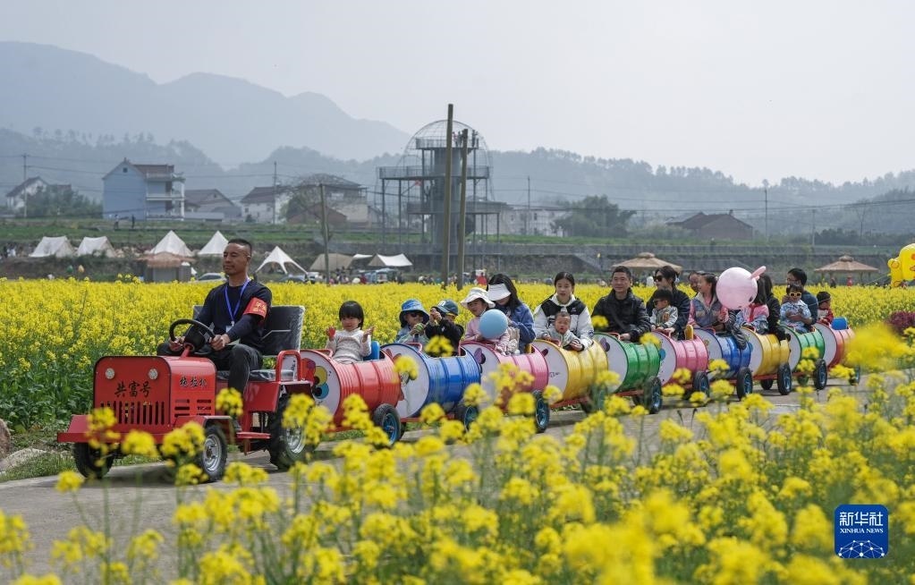 在浙江杭州臨安區(qū)青山湖街道郎家村“共富稻田”,游客乘坐田野小火車在油菜花地里感受春日美景(4月1日攝)?!肮哺坏咎铩倍ㄎ欢喙δ芴飯@農(nóng)旅綜合體,陸續(xù)打造了妙哉花園、稻田觀光道、稻田餐廳、稻田茶吧等鄉(xiāng)村旅游特色節(jié)點(diǎn),吸引城市居民前來(lái)體驗(yàn)戶外農(nóng)田生活。新華社記者 徐昱 攝