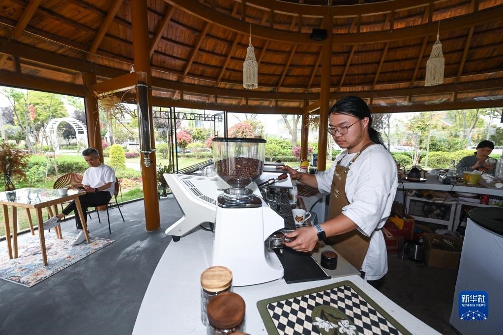 工作人員在浙江湖州織里鎮(zhèn)伍浦村漁耕文化園的陶灣里鄉(xiāng)村咖啡店工作(4月11日攝)。近年來(lái),織里鎮(zhèn)依托當(dāng)?shù)孛利愢l(xiāng)村建設(shè)以及自然風(fēng)光,招引鄉(xiāng)賢返鄉(xiāng)創(chuàng)業(yè),依托閑置民宅、閑置土地建設(shè)特色咖啡店、花海景觀、特色民宿和農(nóng)家樂(lè)等,發(fā)展鄉(xiāng)村旅游經(jīng)濟(jì)。新華社記者 徐昱 攝
