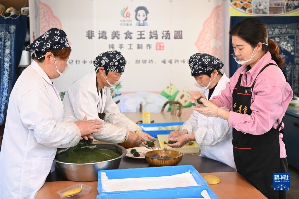 在浙江寧波奉化區(qū)西塢街道廟后周村,毛美兒(右一)與村民一同制作青團(tuán)(3月8日攝)。自2015年創(chuàng)業(yè)起,“王媽湯圓”負(fù)責(zé)人毛美兒將制作本地非遺美食的技藝傳授給當(dāng)?shù)貗D女,已帶動(dòng)60余位農(nóng)村婦女制作、銷售美食,共同增收致富。新華社記者 黃宗治 攝