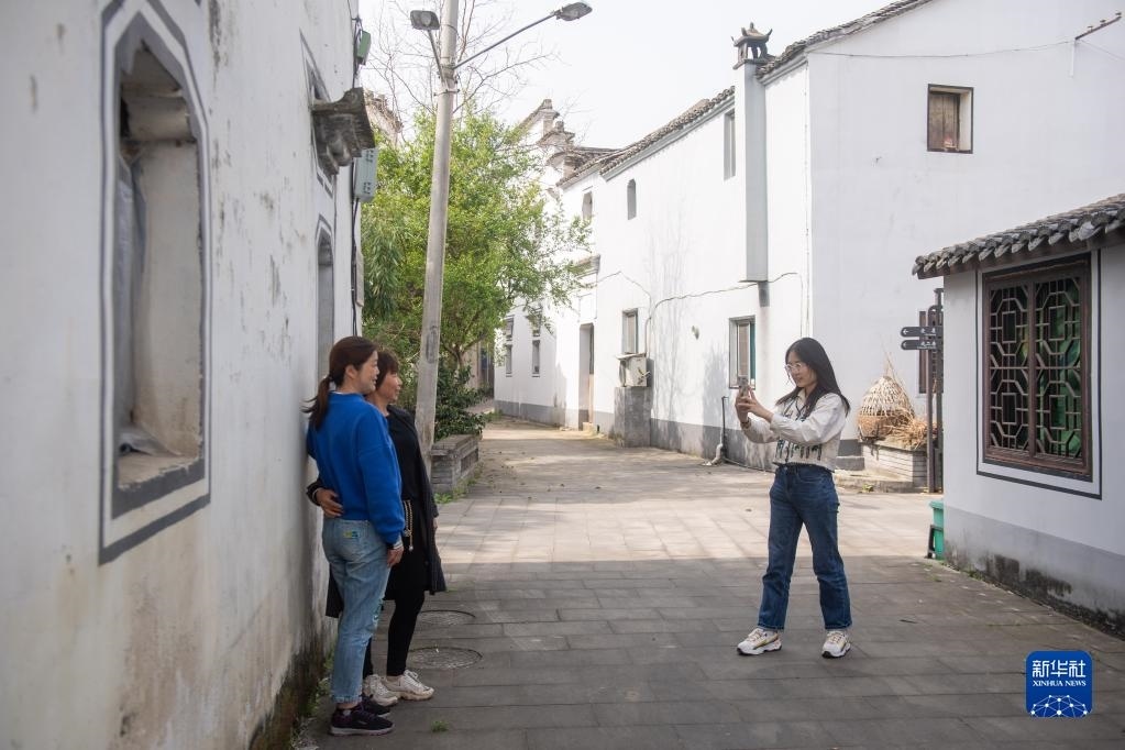 游客在浙江諸暨暨南街道周村古村落內(nèi)游玩拍照(4月12日攝)。暨南街道周村是歷史文化村落,擁有豐富的古建筑資源。新華社記者 江漢 攝