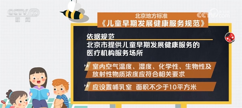 依據(jù)規(guī)范,北京市提供兒童早期發(fā)展健康服務(wù)的醫(yī)療機(jī)構(gòu)服務(wù)場(chǎng)所應(yīng)遠(yuǎn)離各種污染源,采光充足,通風(fēng)良好,遠(yuǎn)離噪聲與電磁干擾;設(shè)置防蚊、蟲、蠅、鼠等設(shè)備,并放置于兒童無法接觸到的地方;室內(nèi)空氣溫度、濕度、化學(xué)性、生物性及放射性物質(zhì)濃度應(yīng)符合相關(guān)要求。應(yīng)設(shè)置哺乳室,面積不少于10平方米;設(shè)置幼兒專用便器、洗手池等衛(wèi)生設(shè)施;服務(wù)設(shè)施應(yīng)光滑、牢固,無尖銳棱角、鋒利切面、毛邊、倒刺、零件脫落、繩索等安全隱患。