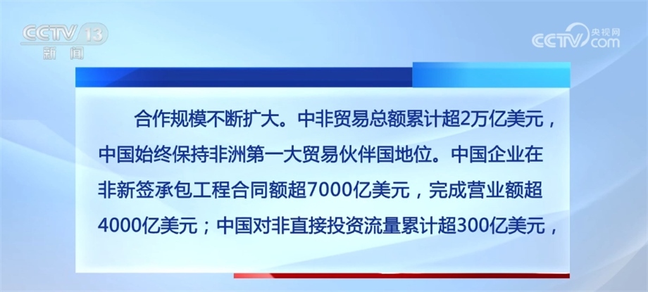 合作規(guī)模不斷擴大。中非貿(mào)易總額累計超2萬億美元,中國始終保持非洲第一大貿(mào)易伙伴國地位。中國企業(yè)在非新簽承包工程合同額超7000億美元,完成營業(yè)額超4000億美元;中國對非直接投資流量累計超300億美元,已成為非洲第四大投資來源國;向非洲國家派遣醫(yī)療隊員約9000人次,提供研修培訓名額超過10萬個,一批基礎(chǔ)設施和社會民生項目相繼建成。