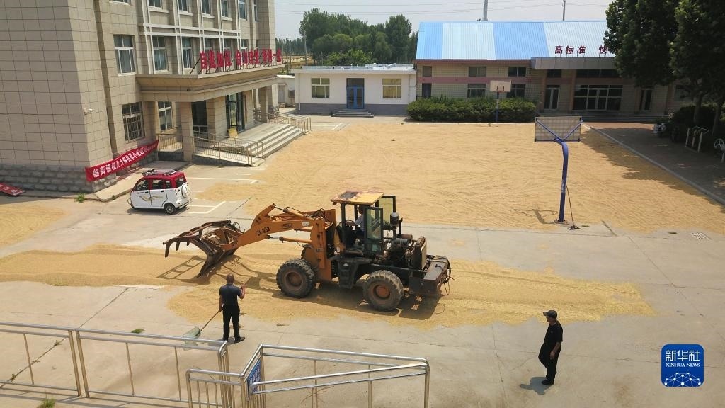 6月13日,農(nóng)戶在臨邑縣臨盤街道政府大院曬糧。