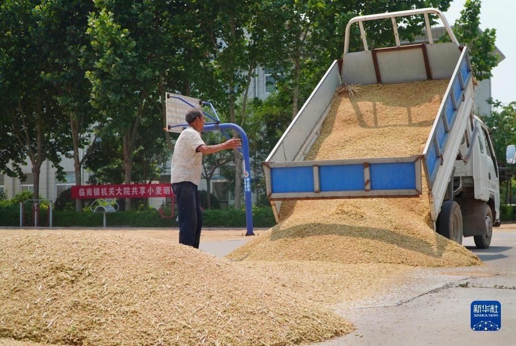 6月13日,農(nóng)戶把剛收獲的小麥運(yùn)到臨邑縣臨南鎮(zhèn)政府大院晾曬。