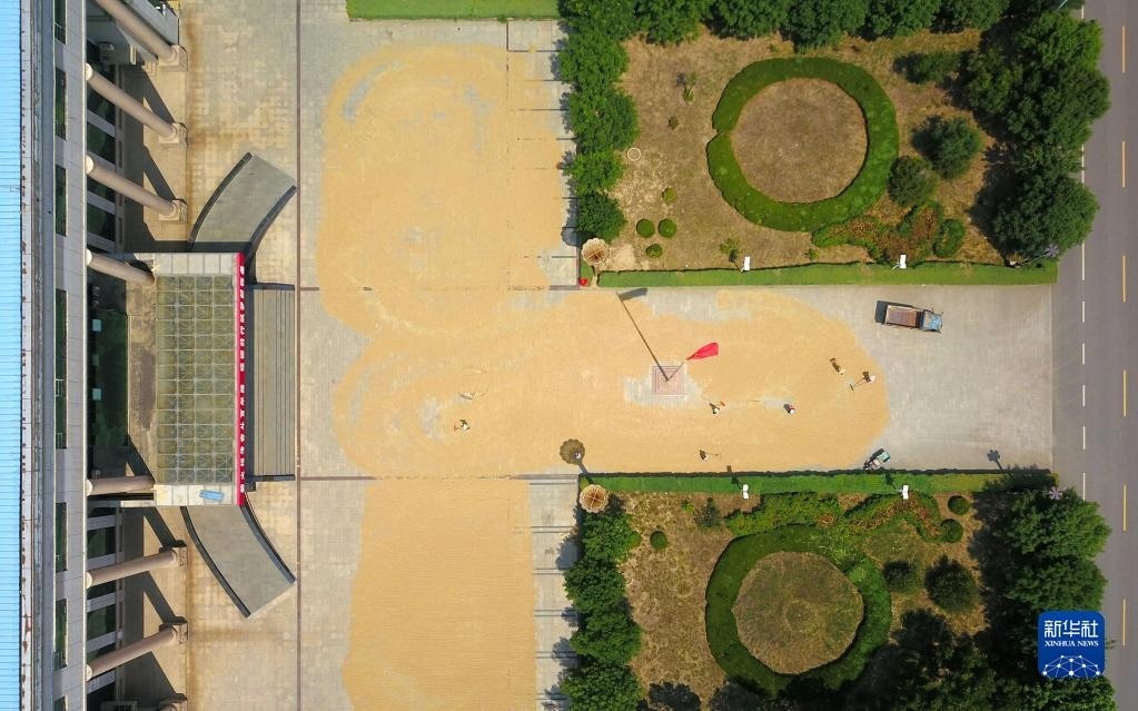 6月13日,農(nóng)戶在臨邑縣臨南鎮(zhèn)政府大院曬糧(無人機(jī)照片)。