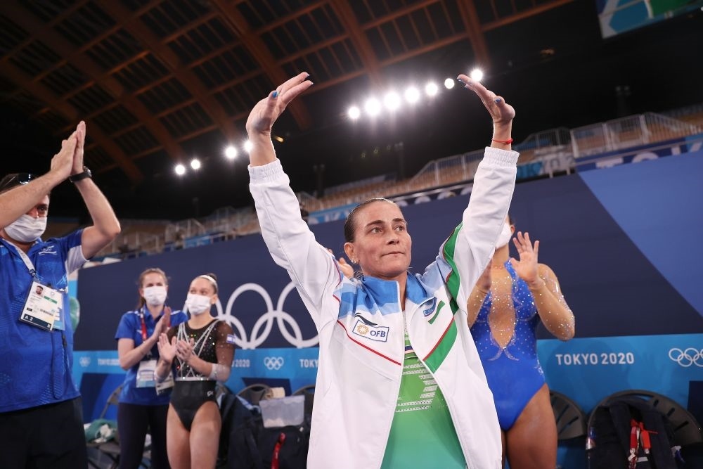 2021年7月25日,46歲的烏茲別克斯坦體操名將丘索維金娜在東京奧運(yùn)會體操女子資格賽后向觀眾揮手致意。新華社記者 曹燦 攝