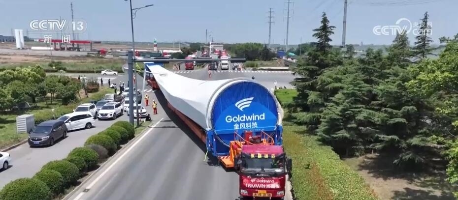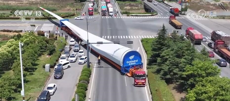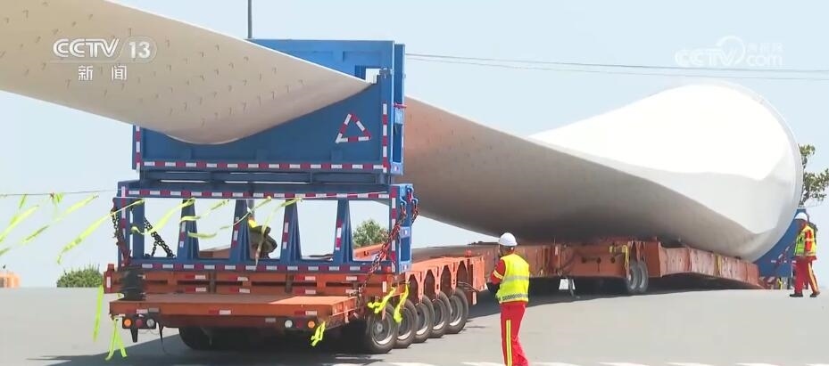 央視網(wǎng)消息:今天(6月14日)上午,100%我國自主知識產(chǎn)權(quán)的123米超長海上風(fēng)電葉片在江蘇連云港啟動陸地轉(zhuǎn)運(yùn)工作。上午9時,代表著我國風(fēng)電裝備最新技術(shù)水準(zhǔn)的大葉片,從廠區(qū)到港口碼頭,陸地運(yùn)輸全程約30公里,耗時約3到4個小時,其中運(yùn)輸大葉片的車輛還要拐過90度的直角彎。如此大體量的裝備運(yùn)輸是一個復(fù)雜的過程,其中有哪些技術(shù)難點(diǎn)?來看記者今天上午從現(xiàn)場發(fā)回的報道。