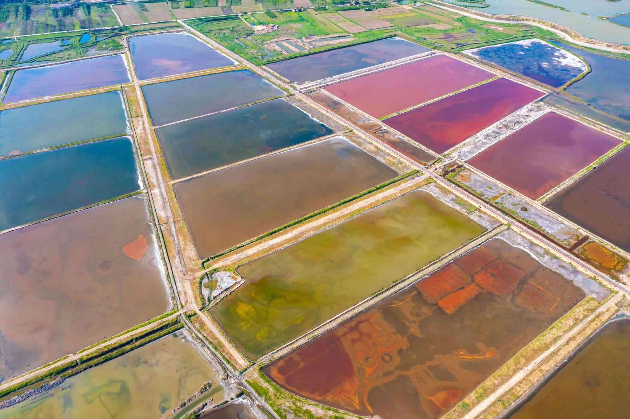 2023年6月14日,山西運城,七彩鹽湖呈現(xiàn)出色彩斑斕的景觀,猶如大地調(diào)色板,美不勝收。視覺中國