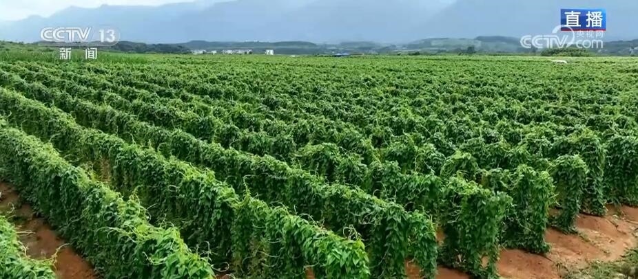 總臺記者 廖汨:我現(xiàn)在就在富川瑤族自治縣富陽鎮(zhèn)江塘村的淮山種植基地,整個基地淮山的種植面積有300多畝,這些淮山是在今年2月至5月分批種下的,通過我們的直播實時鏡頭,可以很直觀地看到,翠綠的淮山藤順著竹籬茂盛地生長著,長勢相當好。預計8月底開始第一批采挖,整個采挖期可以持續(xù)到明年的四五月份。而現(xiàn)在,村民們正忙著進行除草、間苗、管護等工作。