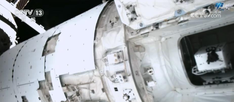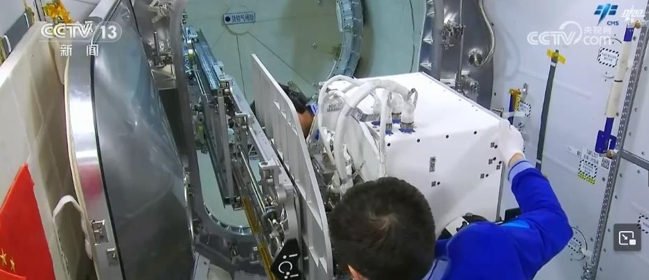 這是3位航天員正在夢天實(shí)驗(yàn)艙進(jìn)行空間輻射生物學(xué)暴露實(shí)驗(yàn)裝置出艙工作,航天員將載荷安裝到載荷轉(zhuǎn)移機(jī)構(gòu)。載荷出艙前,航天員在反復(fù)仔細(xì)檢查,隨后,關(guān)閉夢天實(shí)驗(yàn)艙貨物氣閘艙艙門。通過該裝置開展空間粒子輻射等環(huán)境要素,對樣本材料生物學(xué)效應(yīng)的研究,為科學(xué)實(shí)驗(yàn)生物樣品提供生命保障。