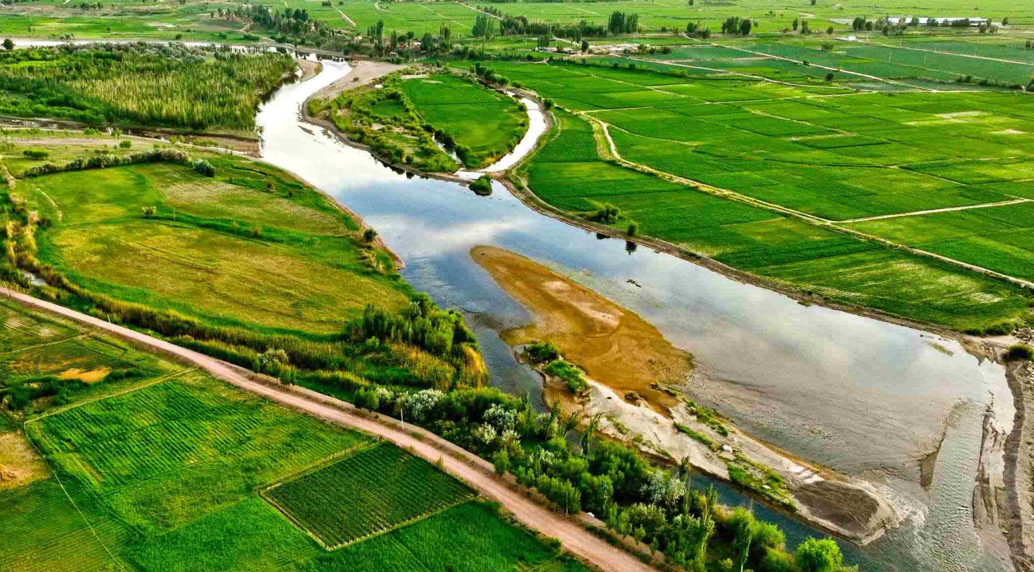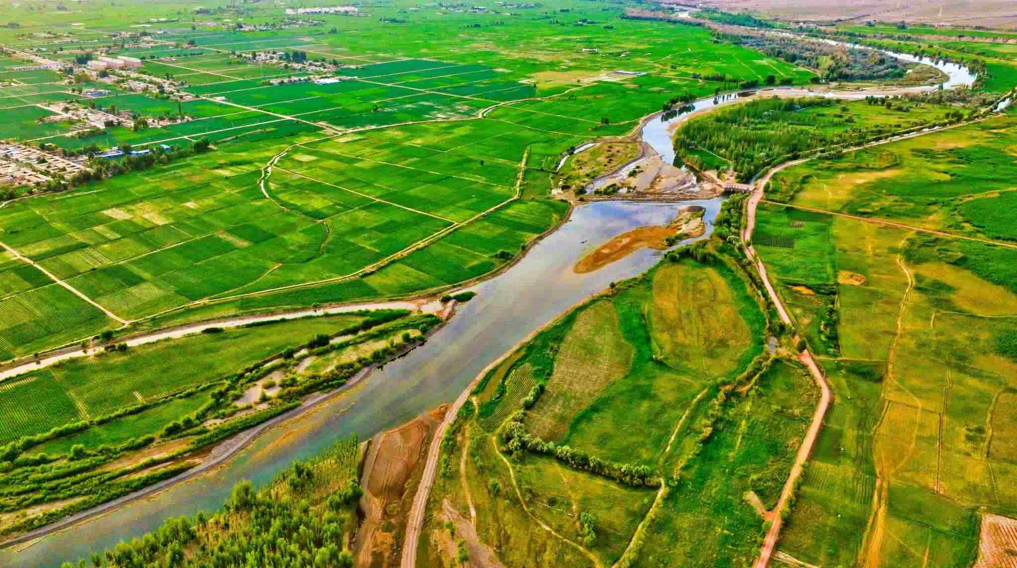 2023年6月15日,甘肅省張掖市,甘州區(qū)靖安鄉(xiāng)、臨澤縣板橋鎮(zhèn)境內(nèi)的黑河兩岸,寬闊的河床、彎曲的河流、農(nóng)作物以及樹(shù)木、蘆葦、濕地在夕陽(yáng)的映照下綠意盎然。視覺(jué)中國(guó)
