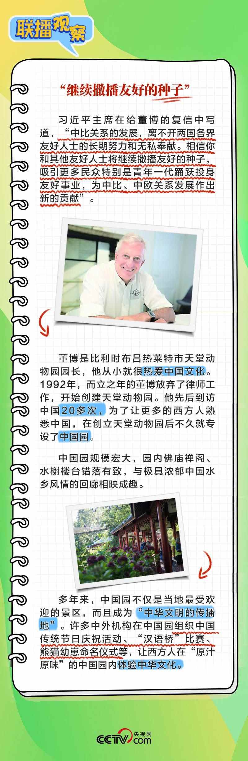 董博是比利時布呂熱萊特市天堂動物園園長,他在給習(xí)主席致信中回顧了習(xí)主席和夫人彭麗媛2014年3月訪比期間出席天堂動物園大熊貓園開園儀式的情景,表示中國園體現(xiàn)人與自然和諧共生理念,中國夢和中國的發(fā)展繁榮永遠(yuǎn)是可共享的機遇。
