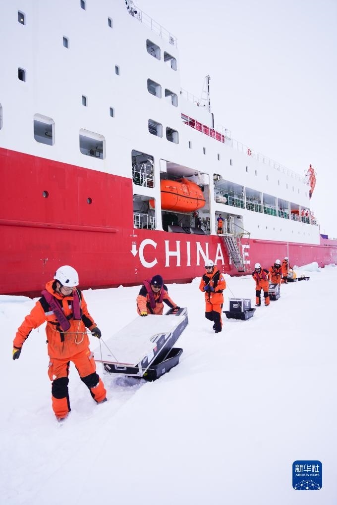 北京時間5日上午10時,作業(yè)結(jié)束。上船稍事休整,考察隊全體成員下到冰面拍攝大合影。合影間隙,科考隊員三五成群,舉著臨時制作的標語橫幅,在“雪龍2”號前拍照留念。