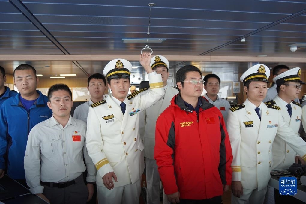 報告聲響徹駕駛臺,“雪龍2”號船長肖志民旋即拉響汽笛。接著,“雪龍2”號停止前行,中國第13次北冰洋科學考察隊領(lǐng)隊王金輝走向廣播臺,通過全船廣播宣告——