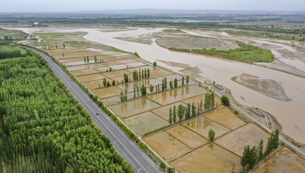 流經(jīng)寧夏青銅峽市境內(nèi)的黃河,滋潤著岸邊水稻和各種植被(無人機照片,5月25日攝)。新華社記者馮開華 攝