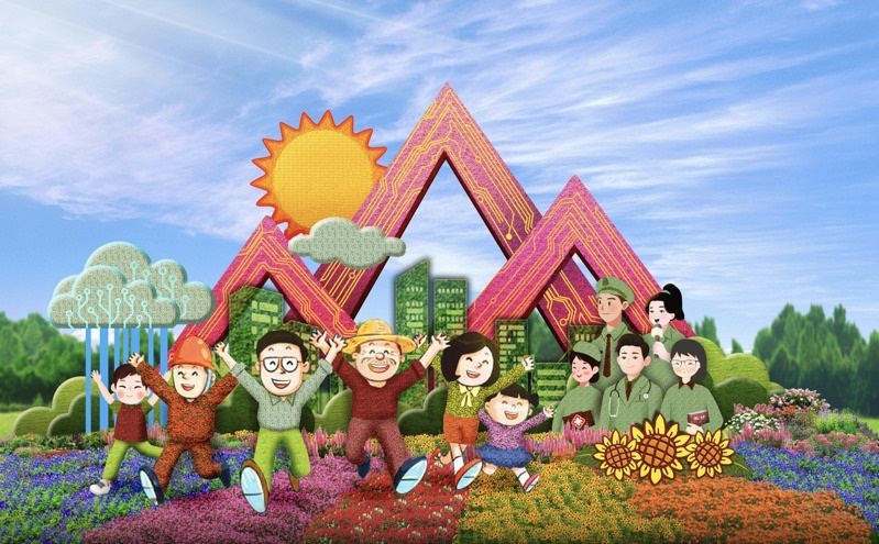 4,東單西北角的“和諧共生”花壇頂高8.5米,“三北工程”綠色長(zhǎng)城為主景,配以野馬(西北)、麋鹿(華北)、白鶴(東北)、胡楊等典型物種,體現(xiàn)了生態(tài)治理的典范,寓意堅(jiān)定不移走好人與自然和諧共生的中國式現(xiàn)代化之路。