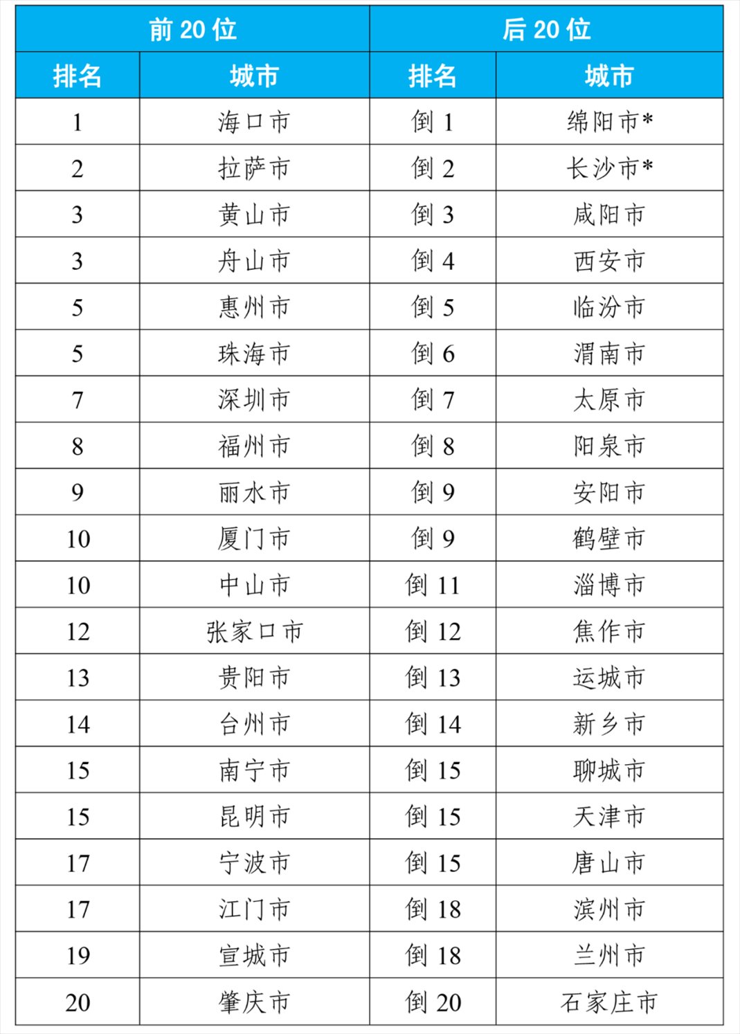 1—8月,168個重點(diǎn)城市中,空氣質(zhì)量排名前20位城市依次是???、拉薩和黃山等城市(從第1名至第20名);空氣質(zhì)量排名后20位城市依次是綿陽、長沙和咸陽等城市(從倒數(shù)第1名至倒數(shù)第20名)。其中,綿陽市科技城新區(qū)的高新區(qū)自來水公司站點(diǎn)4月和5月、長沙市開福區(qū)的伍家?guī)X站點(diǎn)6月受到嚴(yán)重人為干擾,對所在城市當(dāng)月六項(xiàng)污染物濃度進(jìn)行了最大值替代處理。見附表2。