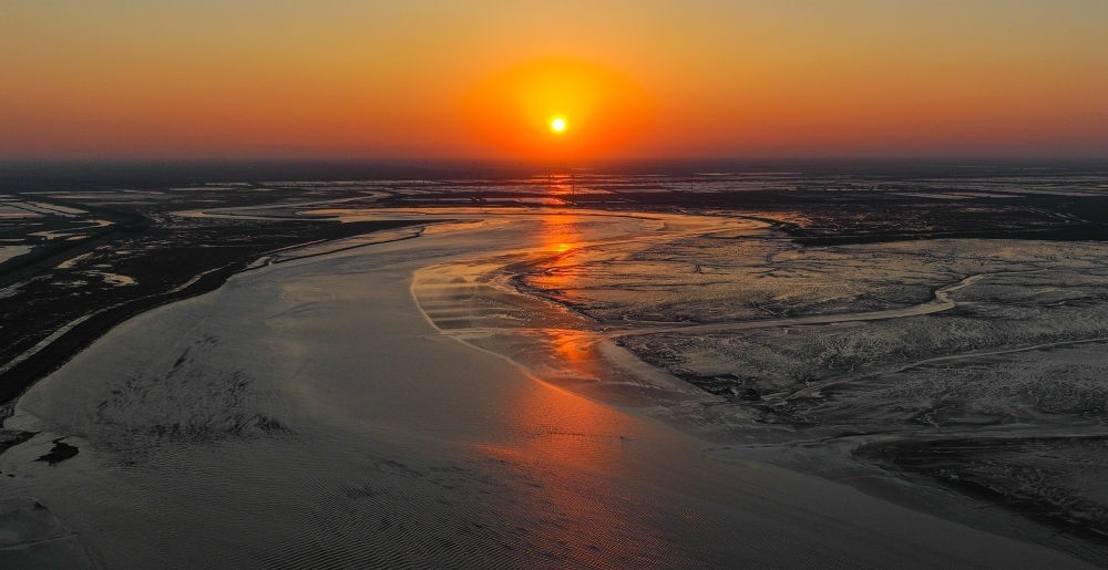 這是鹽城東臺條子泥濕地日出景色(9月1日攝,無人機(jī)照片)。