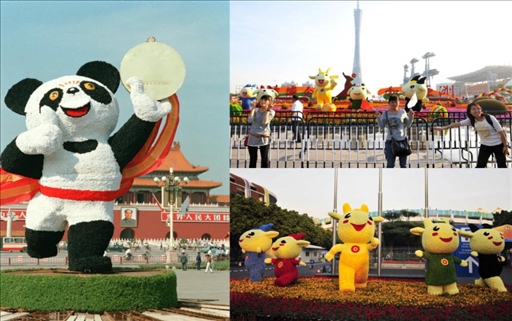 左圖:第11屆亞運(yùn)會吉祥物熊貓“盼盼”的造型;右上圖:人們在第16屆亞運(yùn)會吉祥物“祥和如意樂洋洋”雕塑前拍照;右下圖:廣州亞運(yùn)會吉祥物造型花卉。資料照片