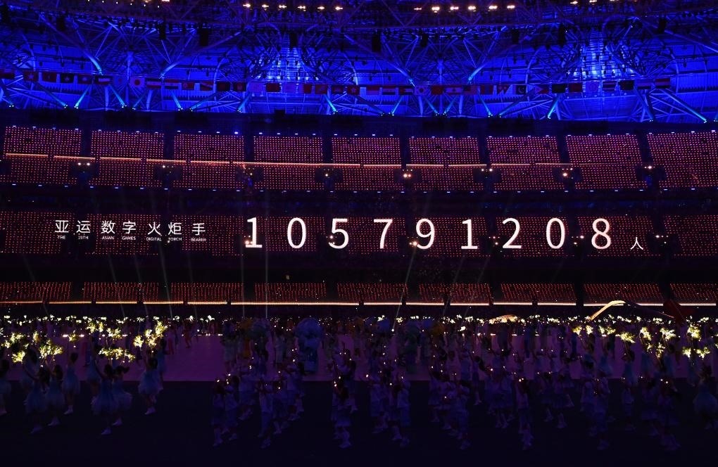 這是9月23日拍攝的開幕式現(xiàn)場顯示的亞運(yùn)數(shù)字火炬手人數(shù)。新華社記者黃宗治攝