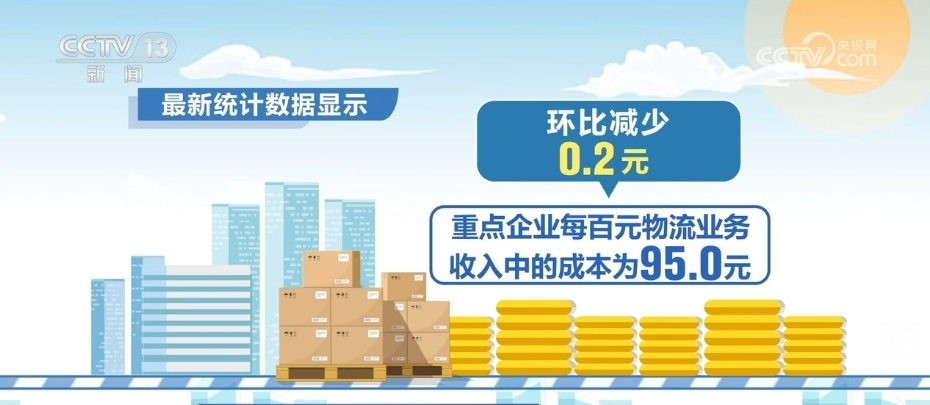 據(jù)介紹,近期,上游原材料價(jià)格趨緩,物流企業(yè)經(jīng)營成本壓力略有緩解。最新統(tǒng)計(jì)數(shù)據(jù)顯示,重點(diǎn)企業(yè)每百元物流業(yè)務(wù)收入中的成本為95.0元,環(huán)比減少0.2元。