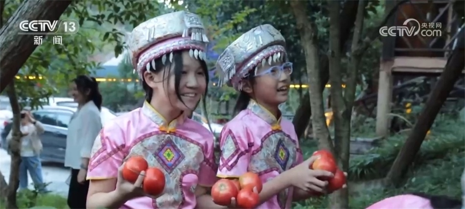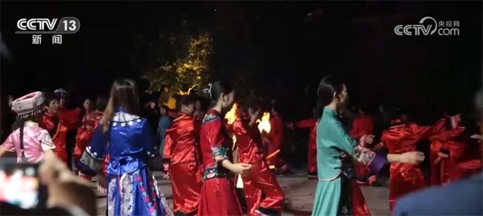 隨著歡快的音樂響起,當?shù)卮迕翊┥仙术r艷的節(jié)日盛裝,踏著鼓點,圍著篝火跳起土家擺手舞,豐收的喜悅洋溢在村民們的臉上,游客們加入其中,大家手牽著手,共同舞出金秋和美鄉(xiāng)村新畫卷。