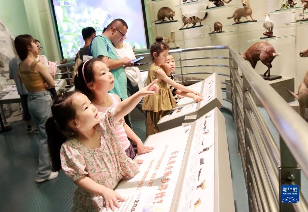 7月8日,小觀眾在江蘇常州博物館參觀動物標本。